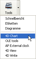 - Sie rufen den Diagrammassistenten direkt aus 4D auf. Dazu wählen Sie im Menü Bericht von 4D oder in der Werkzeugleiste im DropDown-Menü zum Icon Tools den Befehl 4D Chart.