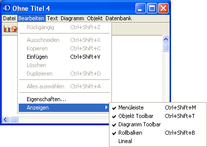 Hinweis: Ist die Menüleiste von 4D Chart ausgeblendet, können Sie diese unter Windows mit der Tastenkombination Strg+Umschalttaste+M, auf Macintosh mit Befehls- +Umschalttaste+M wieder anzeigen.
