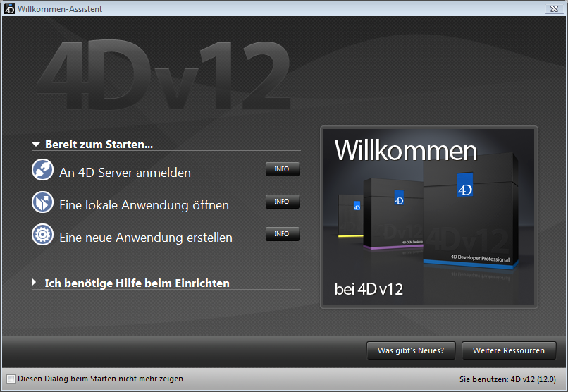 Starten Sie das 4D Programm zum ersten Mal oder haben Sie die Startup-Parameter nicht geändert, erscheint auf dem Bildschirm der Willkommen-Assistent: