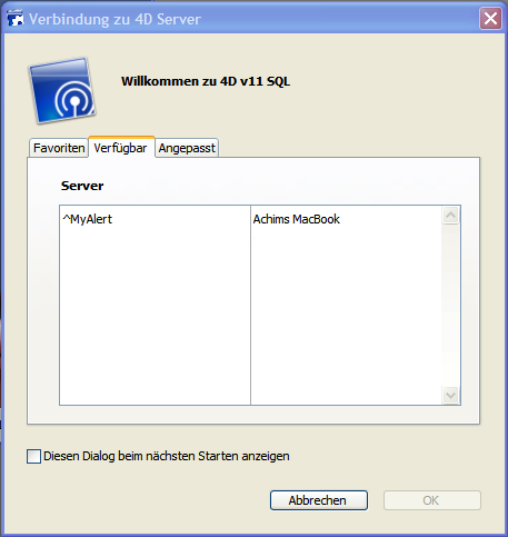 wenn dieser Dialog nicht erscheint, wählen Sie im Menü Datei/Ablage von 4D den Befehl Öffnen>Remote Anwendung
