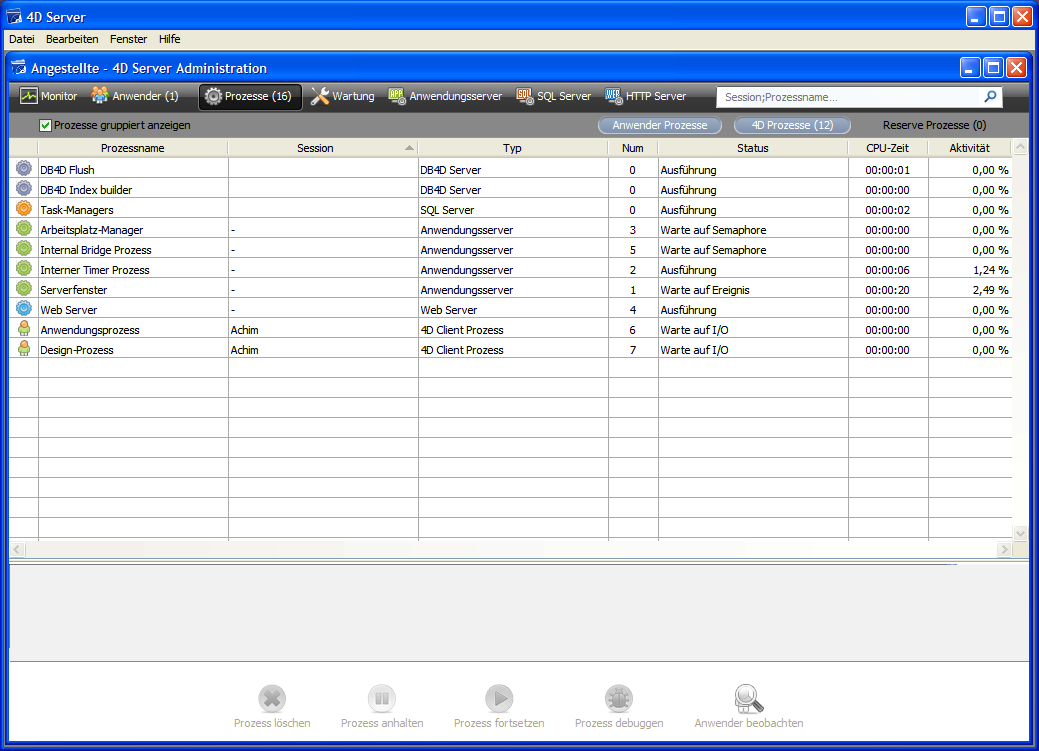 Die ersten zwölf Prozesse betreffen den Server, sie wurden beim Starten von 4D Server eingerichtet. Die vier neuen Prozesse (in 2 Zeilen gruppiert) betreffen den ersten Benutzer, der sich am Server angemeldet hat: