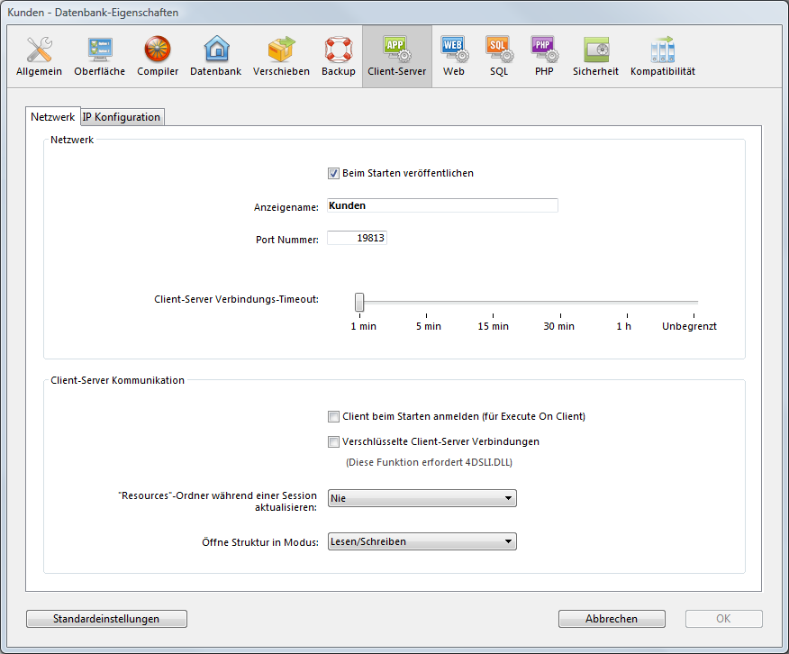 Sie können in den Datenbank-Eigenschaften auf der Seite Client-Server die Parameter für das Netzwerk und die Client/Server Kommunikation festlegen. Sie ist für 4D im remote Modus und 4D Server zugänglich.