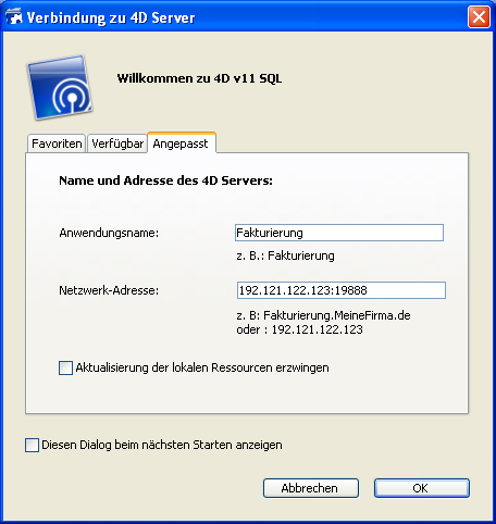 Hinweis: Dieser Parameter wird bei eigenen Client-/Server-Anwendungen nicht berücksichtigt. Im Prinzip meldet sich die Client-Anwendung direkt an die Server Anwendung an, ohne über den Anmeldedialog zu gehen. Der Dialog erscheint jedoch, wenn ein Fehler auftritt; in diesem Fall ist der Publikationsname der Server-Anwendung der Name der kompilierten Datenbank.