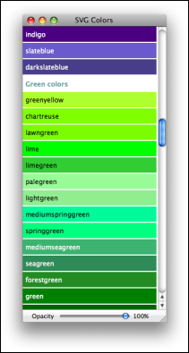 A paleta de cores mostra o nome e um exemplo de cada cor especificado na norma SVG, assim como um controle se desliza que pode ser utilizado para mudar a opacidade: