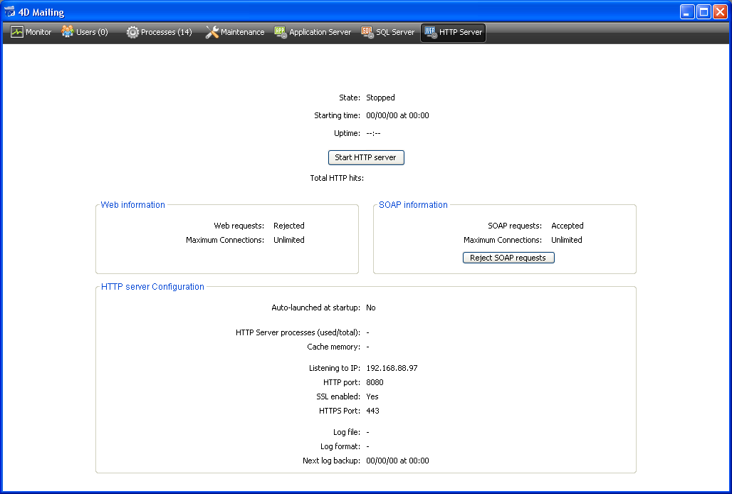 • When the HTTP server state is "Stopped," the button is titled Start HTTP Server. If you click on this button, the 4D Server HTTP server is immediately started; Web and SOAP requests are accepted (note that it is possible to stop the SOAP server separately, see the “SOAP Information” paragraph below).