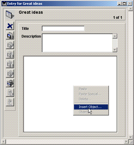 For more information about the options of the standard OLE Insert Object dialog box, please refer to your Windows documentation.