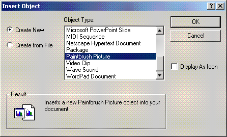 Choose Insert Object from the menu. The standard Insert Object dialog box is displayed. Choose for example PaintBrush picture and click OK: