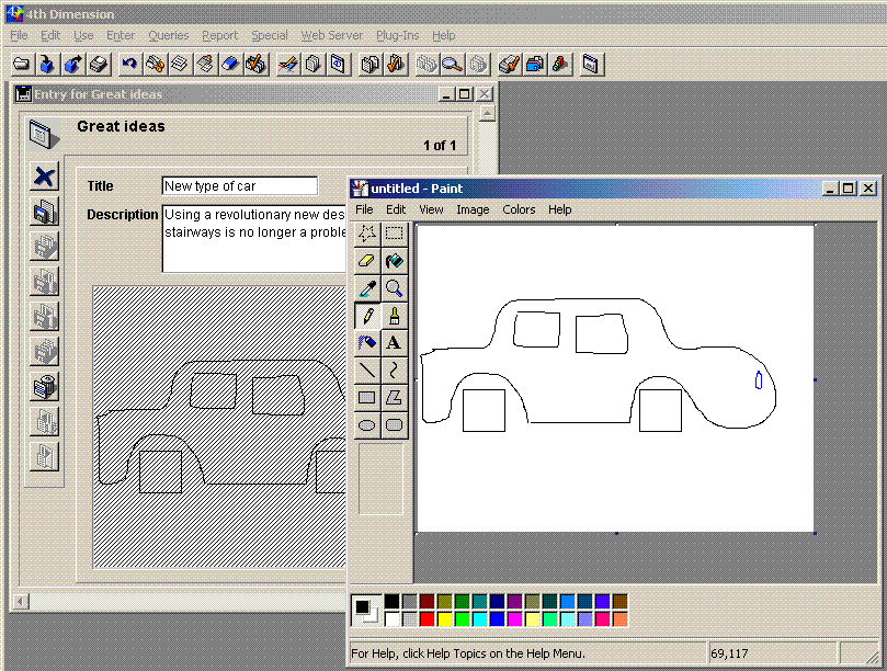 Make a simple drawing in PaintBrush. Note that your drawings appear concurrently within PaintBrush and your 4D OLE area: