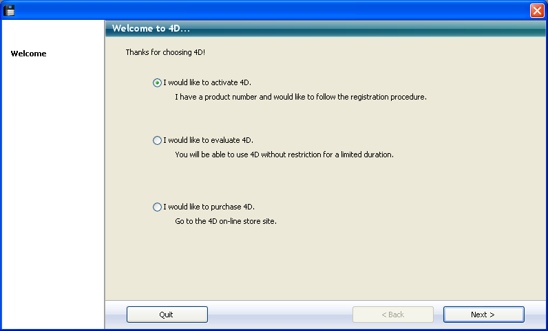- I would like to activate 4D: starts the procedure used to activate the application. Use this option if you have purchased 4D and have a license number.