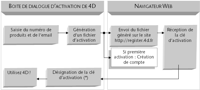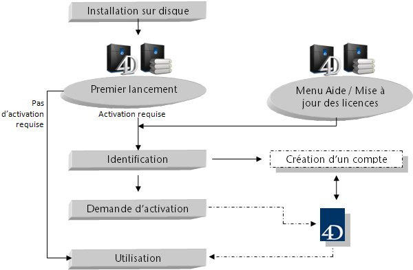 L’activation est un processus interactif au cours duquel vous envoyez à la base clients de 4D SAS vos informations de licence. Après vérification, 4D vous retourne une clé d’activation, le produit est alors utilisable. Vous devez également disposer d’un compte utilisateur auquel sera rattachée la licence.