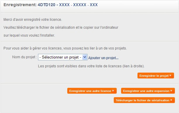 Les projets vous permettent d'organiser vos licences. Ils sont gérés directement dans la boutique 4D Store. - Enregistrer une autre licence ou un autre numéro d'expansion