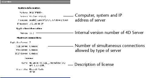 "概要" エリアではシステム、アプリケーション、そして4D Server マシンにインストールされたライセンスに関する様々な情報が提供されます。