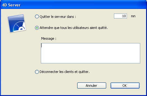 Pour plus d'informations sur cette boîte de dialogue, reportez-vous à la section Quitter 4D Server.
