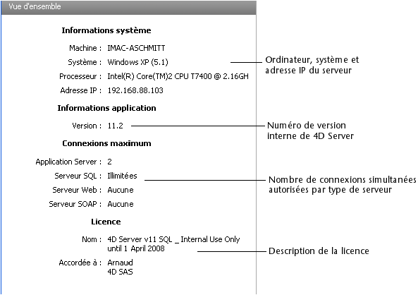 La zone "Vue d’ensemble" fournit diverses informations relatives au système, à l’application et aux licences installées sur la machine de 4D Server.