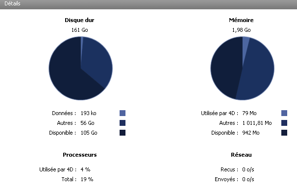 • Mémoire : Mémoire RAM installée sur la machine et quantité de mémoire occupée par 4D Server, par les autres applications ainsi que mémoire disponible.