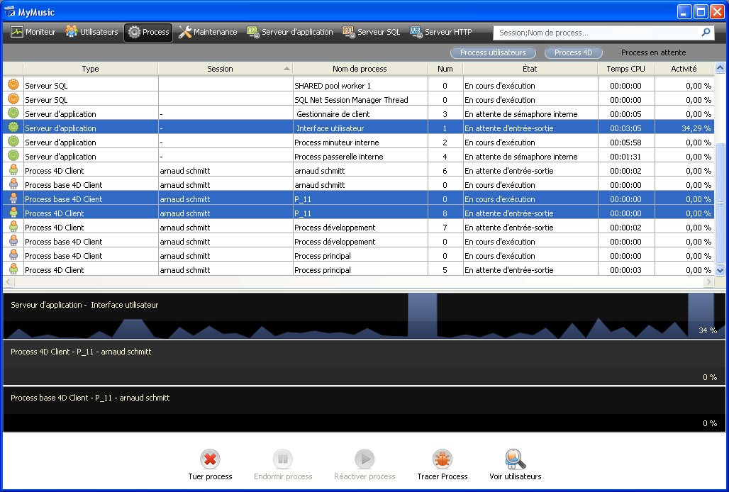 • Process 4D : Process générés par le moteur de 4D Server. Ces process sont précédés d’une icône en forme de roue crantée .