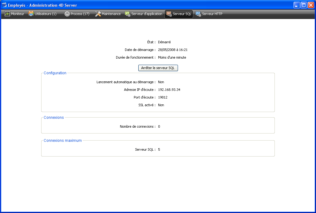 Cette zone fournit plusieurs informations sur les paramètres de configuration du serveur SQL : lancement automatique au démarrage, adresse IP d’écoute, port TCP (19812 par défaut) et activation du SSL pour les connexions SQL (ne concerne pas les connexions 4D ni Web).