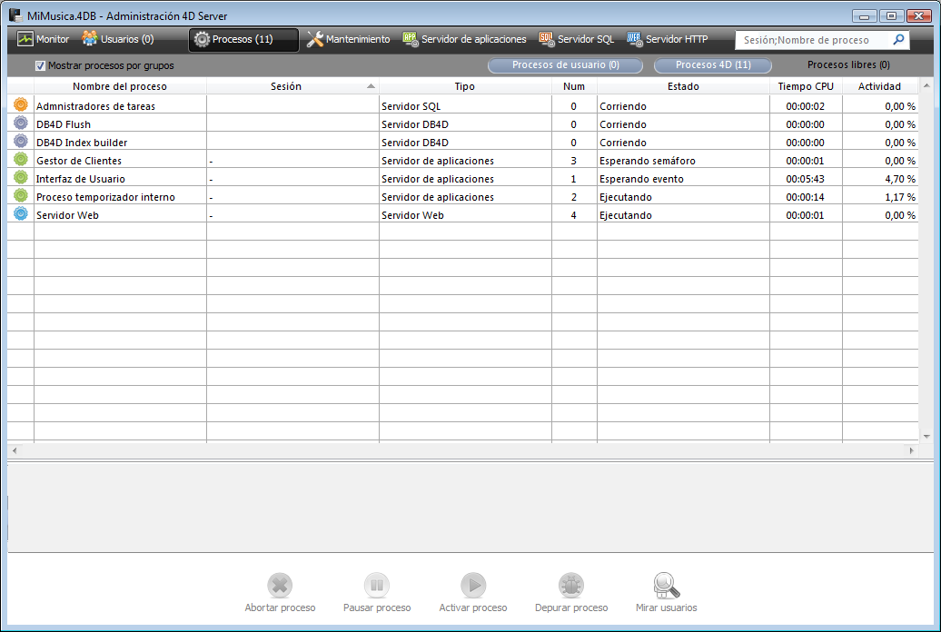 • Procesos libres: procesos inactivos pero que se conservan temporalmente y que pueden reutilizarse en cualquier momento. Este mecanismo optimiza la reactividad de 4D Server. Estos procesos están precedidos por un icono gris en forma de persona.