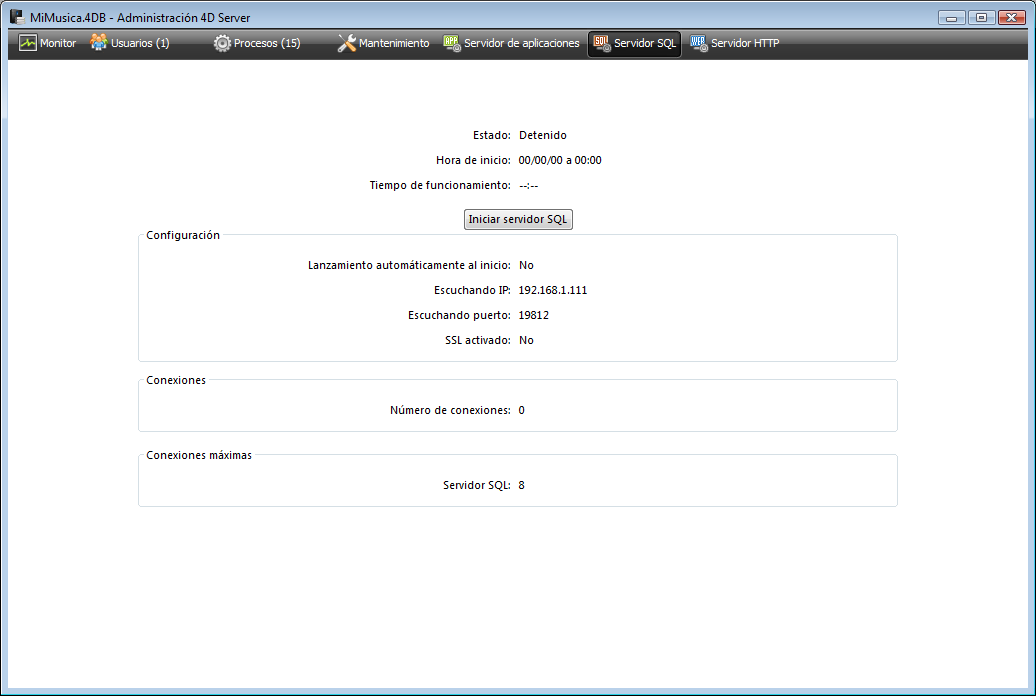 - Cuando el estado del servidor SQL es "Detenido," el botón se llama Iniciar el servidor SQL. Si hace clic en este botón, el servidor SQL de 4D Server se inicia de inmediato; responde a las peticiones SQL externas recibidas en el puerto TCP designado. Note que necesitará una licencia adecuada para poder utilizar el servidor SQL de 4D.