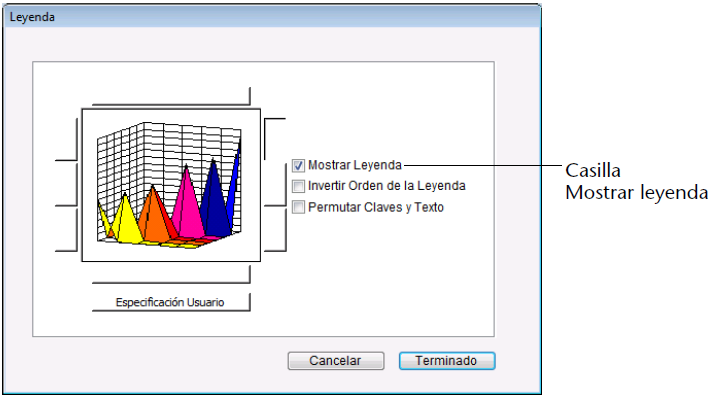 La opción Mostrar leyenda permite mostrar o no la leyenda del gráfico. Si esta caja está selecciona, la leyenda se muestra como parte del objeto gráfico. Si esta caja no está seleccionada, la leyenda se oculta.