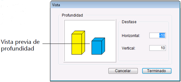 Modifique la profundidad horizontal y vertical, medida en puntos, escribiendo los valores en las áreas de texto respectivas. Para eliminar la ilusión de profundidad, escriba cero en ambas áreas. También puede escribir valores negativos para invertir el eje del efecto tridimensional. Cuando presione la tecla Tab o haga clic fuera del área de texto, el valor que introdujo se verá reflejado en el área de vista previa de profundidad.
