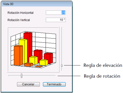 Puede modificar la rotación introduciendo un nuevo valor (de 0 a 90) en el área de texto Rotación o moviendo la regla de rotación hacia la izquierda o hacia la derecha. Rotación es la rotación del gráfico alrededor del eje de valores.