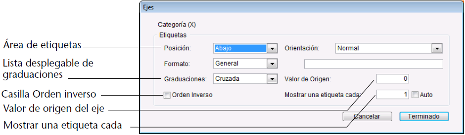 La caja de diálogo Ejes, le permite cambiar la posición de las etiquetas de los ejes, de las graduaciones y del origen. También puede cambiar la escala utilizada en el eje de valores e invertir el orden de los elementos en cada eje. Las opciones disponibles dependen del eje seleccionado. La caja de diálogo de ejes de categorías, le permite personalizar el eje de categorías y el eje de series: