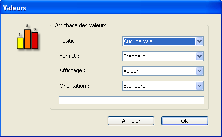 Valeurs : Nombre ou date en chiffres arabes. Vous pouvez montrer des valeurs sur le graphe au lieu d’utiliser des libellés sur l’axe des valeurs, ou bien les utiliser en complément des libellés d’axes.