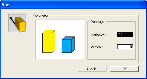 Définissez le décalage horizontal et vertical, mesurés en points, en saisissant les valeurs dans les zones respectives. Vous pouvez saisir des valeurs négatives afin d’inverser l’axe de l’effet 3D. Lorsque vous tapez sur la touche Tabulation ou cliquez dans l’autre zone de saisie, le modèle est modifié pour refléter la valeur que vous avez saisie.