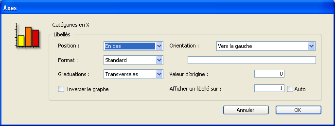 La boîte de dialogue d’axe vous permet de modifier la position des libellés d’axes, des graduations et de l’origine, ainsi que l’échelle utilisée pour l’axe des valeurs. Vous pouvez aussi inverser l’ordre des éléments sur chaque axe. Les options proposées dépendent de l'axe choisi. Voici par exemple la boîte de dialogue de pour les axes des catégories et des séries :