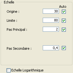 Pour chaque option d’affichage de l’échelle, l’option Auto permet d’activer le fonctionnement par défaut de 4D Chart. Si vous souhaitez utiliser des valeurs personnalisées, n’oubliez pas de désélectionner l’option Auto, sinon vos paramètres ne seront pas pris en compte.