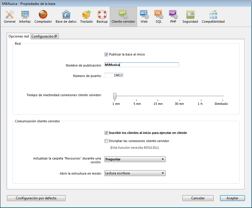 La opción "Inscribir los clientes al inicio para ejecutar en cliente" está disponible en las preferencias de la aplicación, página “Opciones de red” de la página "Cliente-Servidor”: