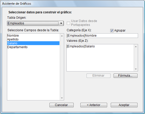 3. Arrastre y suelte el campo Apellido al área Categorías (Eje X) y el campo Salario a la lista Valores (Eje Z):