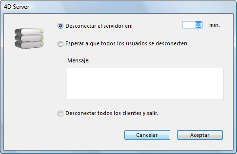 • En todos los casos, si ningún cliente está conectado al servidor cuando la ventana de cierre se valida, 4D Server se cierra inmediatamente.