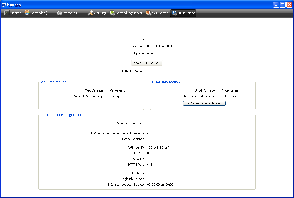 Dieser Bereich zeigt Informationen über die Konfiguration und Operation des HTTP Server:
