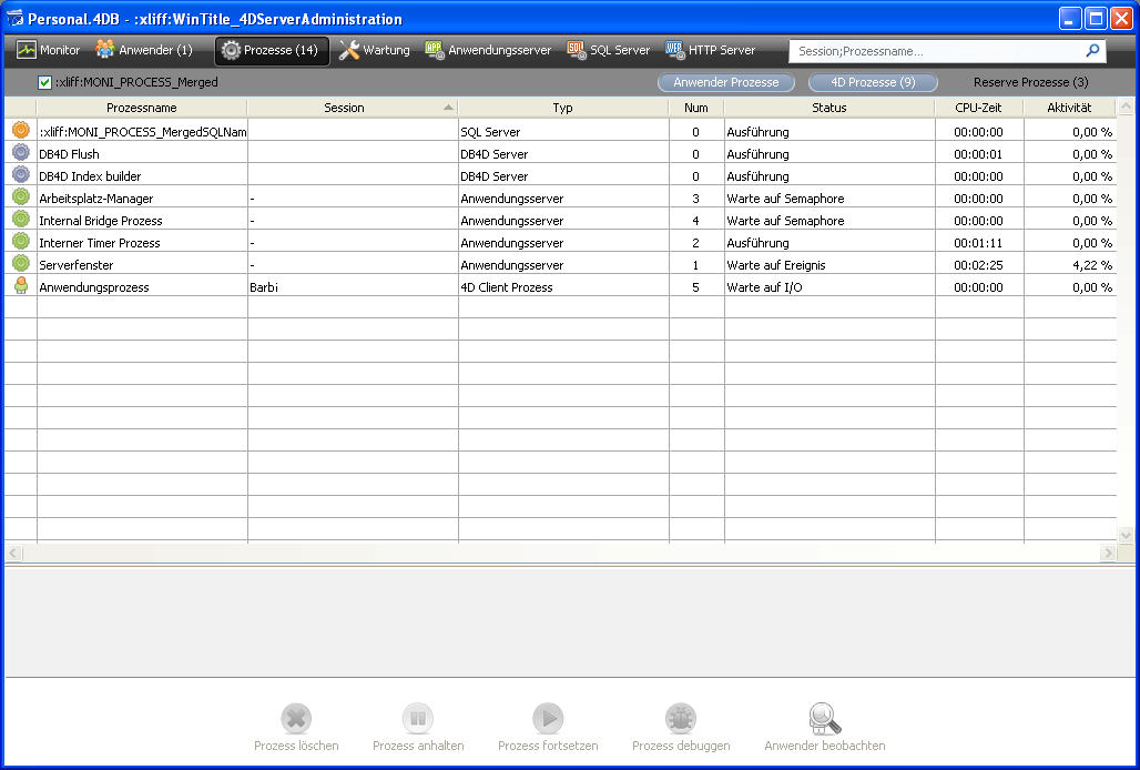 • Session (bei einem 4D Prozess leer, zeigt bei einem Anwenderprozess den Namen des 4D Benutzers),
