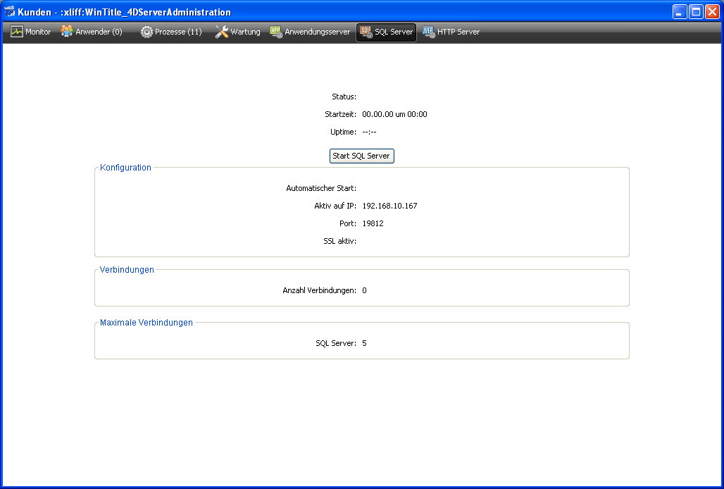Der obere Teil zeigt Informationen über den aktuellen Status des SQL Server von 4D Server.