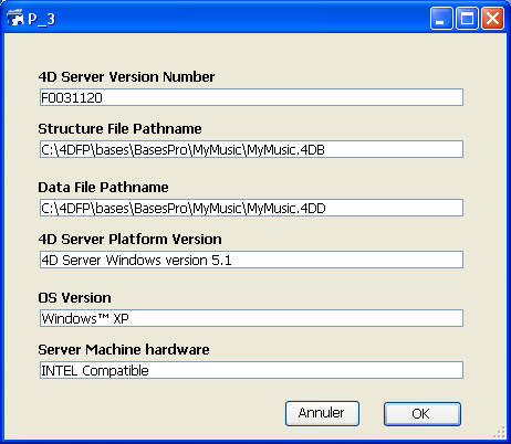 VARIABLE VERS BLOB($arVFreeSpace;[SP Requests]reqData;*)Avec les méthodes projet génériques Client post request et Client get result, la méthode projet M_SERVER_INFORMATION affiche, sur le poste client, les informations sur le serveur retournées par la procédure stockée. Cette méthode pourrait être associée à une commande de menu ou appelée, par exemple, depuis la méthode objet d'un bouton :