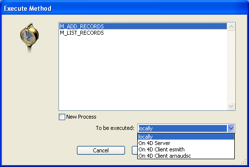 ここからメソッドを4D Serverまたは他の4Dクライアントマシン上で実行できます。このリストに4Dクライアントマシンを表示させるためには、まずそのマシンが登録されていなければならないことに留意してください (クライアントマシン上でのストアドプロシージャREGISTER CLIENTコマンドを参照)。