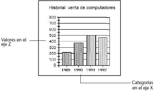 El eje Z también se llama Eje de valores. Utilice el eje Z para mostrar los valores calculados para cada categoría. En el ejemplo de ventas de ordenadores, el eje Z contiene los valores correspondientes a ordenadores vendidos por año. Por ejemplo, si en 2000 se vendieron 750 ordenadores, el valor del eje Z, correspondiente a la categoría “2000” sería 750.