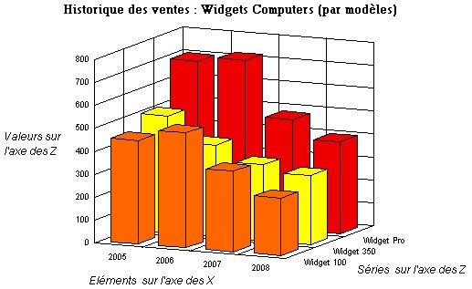 L’axe des Z affiche les valeurs calculées pour l’intersection de chaque catégorie et série. Notre exemple représente les différents types d’ordinateurs vendus par an.