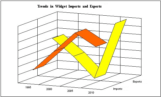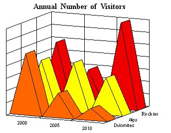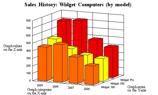 3D 棒グラフは、二次元グラフと同様に、ある項目と別の項目を比較したり、または1 つ以上の項目をある期間にわたって比較します。