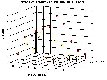3D ピングラフは、3 つの値の交点を表わします。各データポイントはドロップライン(落下線)を用いて項目面につながれます。