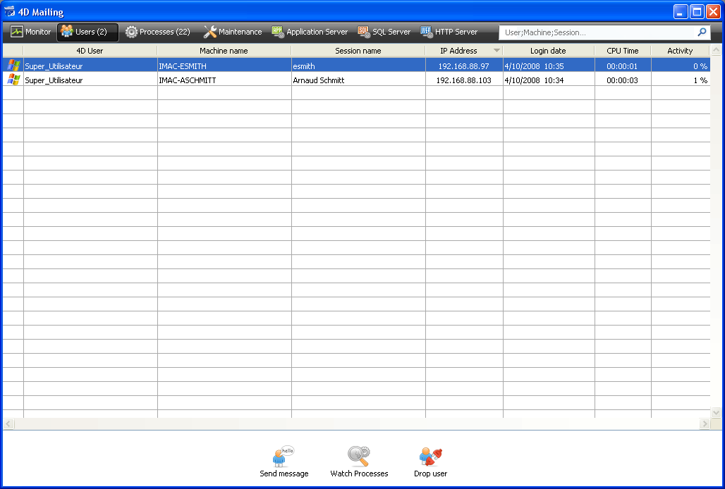 • メッセージ送信: このボタンを使用して、ウィンドウで選択した4D ユーザにメッセージを送信できます。ユーザが選択されていないと、ボタンを使用できません。